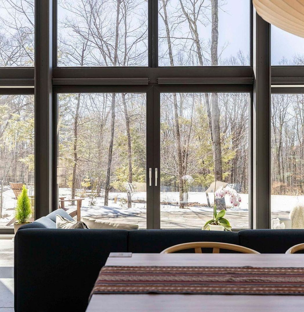 This luminous dining space marries Scandinavian minimalism with organic warmth, where a streamlined wood table creates an inviting gathering spot. Soaring ceilings crowned by a Herman Miller pendant fixture draw the eye upward, while floor-to-ceiling glass walls dissolve boundaries between interior comfort and the serene landscape beyond. Natural wood paneling adds texture, complementing polished concrete floors.